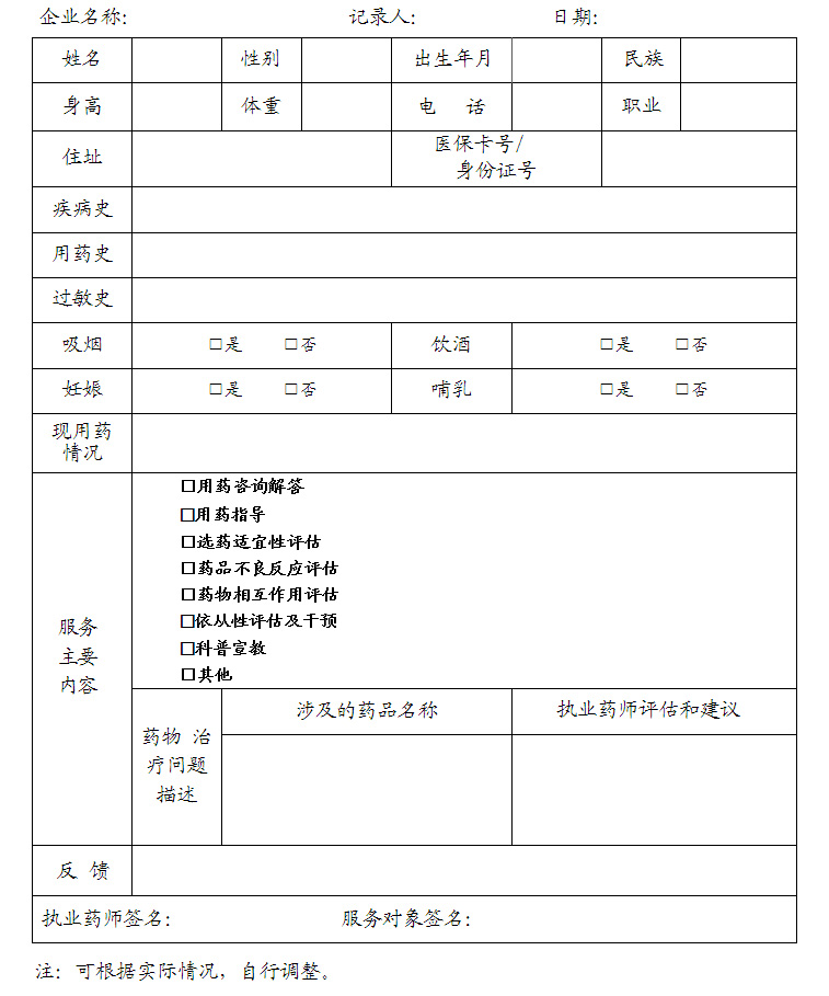 第二十八條 執(zhí)業(yè)藥師應(yīng)當(dāng)建立藥學(xué)服務(wù)記錄并可追溯,記錄應(yīng)當(dāng)完整、客觀、規(guī)范。藥學(xué)服務(wù)記錄(參考模板見附表)主要包括:
